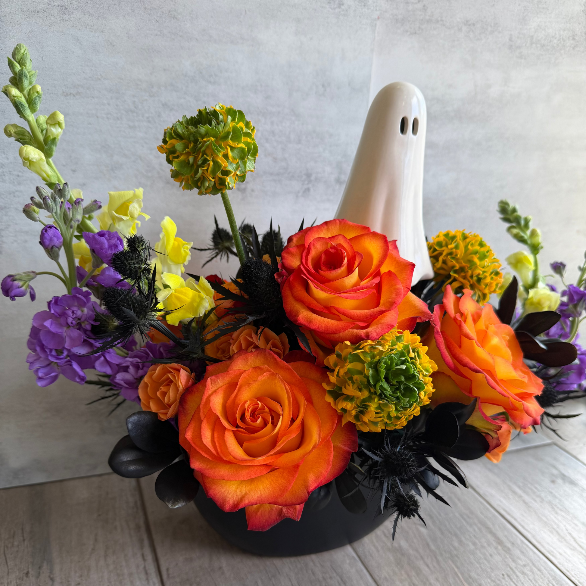Introducing Boo Thang—a hauntingly beautiful Halloween floral arrangement that’s perfect for adding a touch of spooky elegance to your space. Two Sizes Available. ** Add the "Floating Ghost" for extra enchanted haunting vibes!