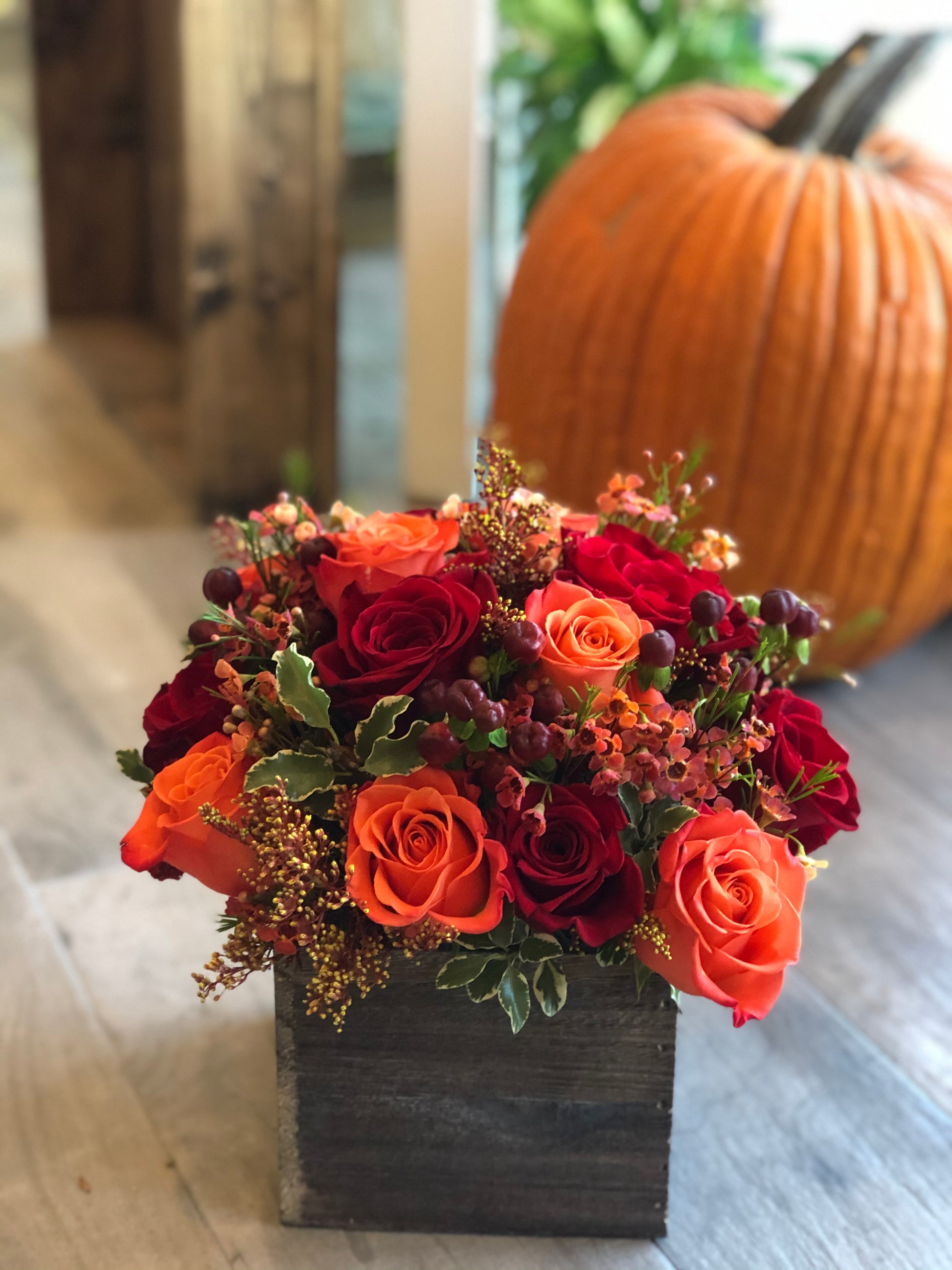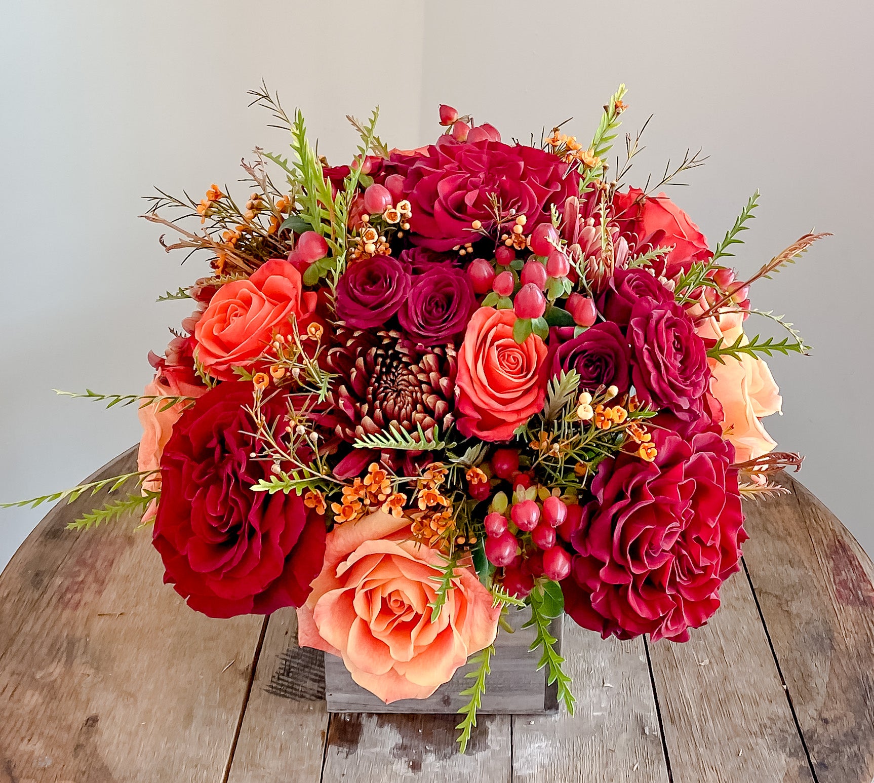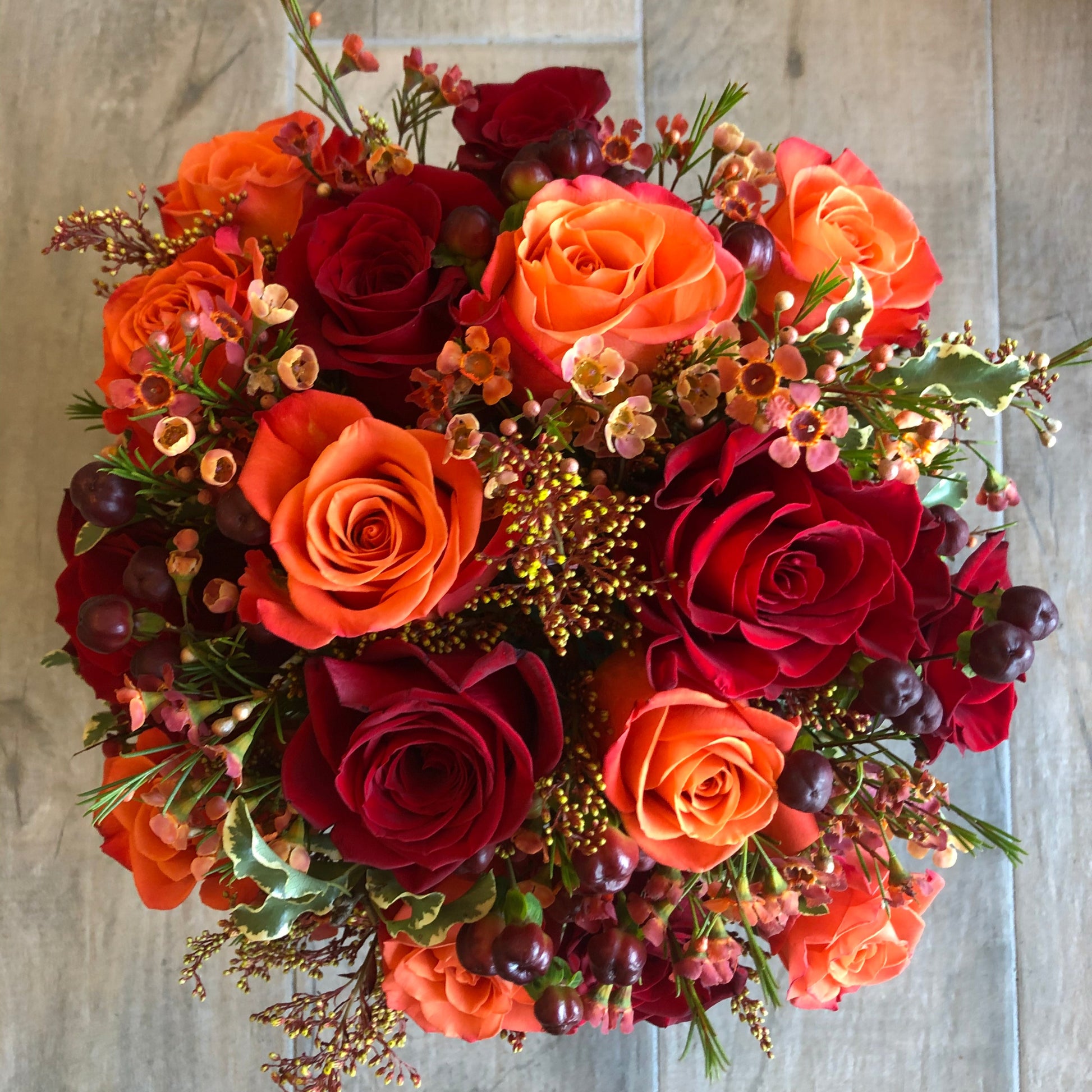 Beautiful Oranges and Deep Reds with lots of beautiful accenting textures. Available in a variety of sizes to fit any location, in our brown boxes, or classically styled glass vase.