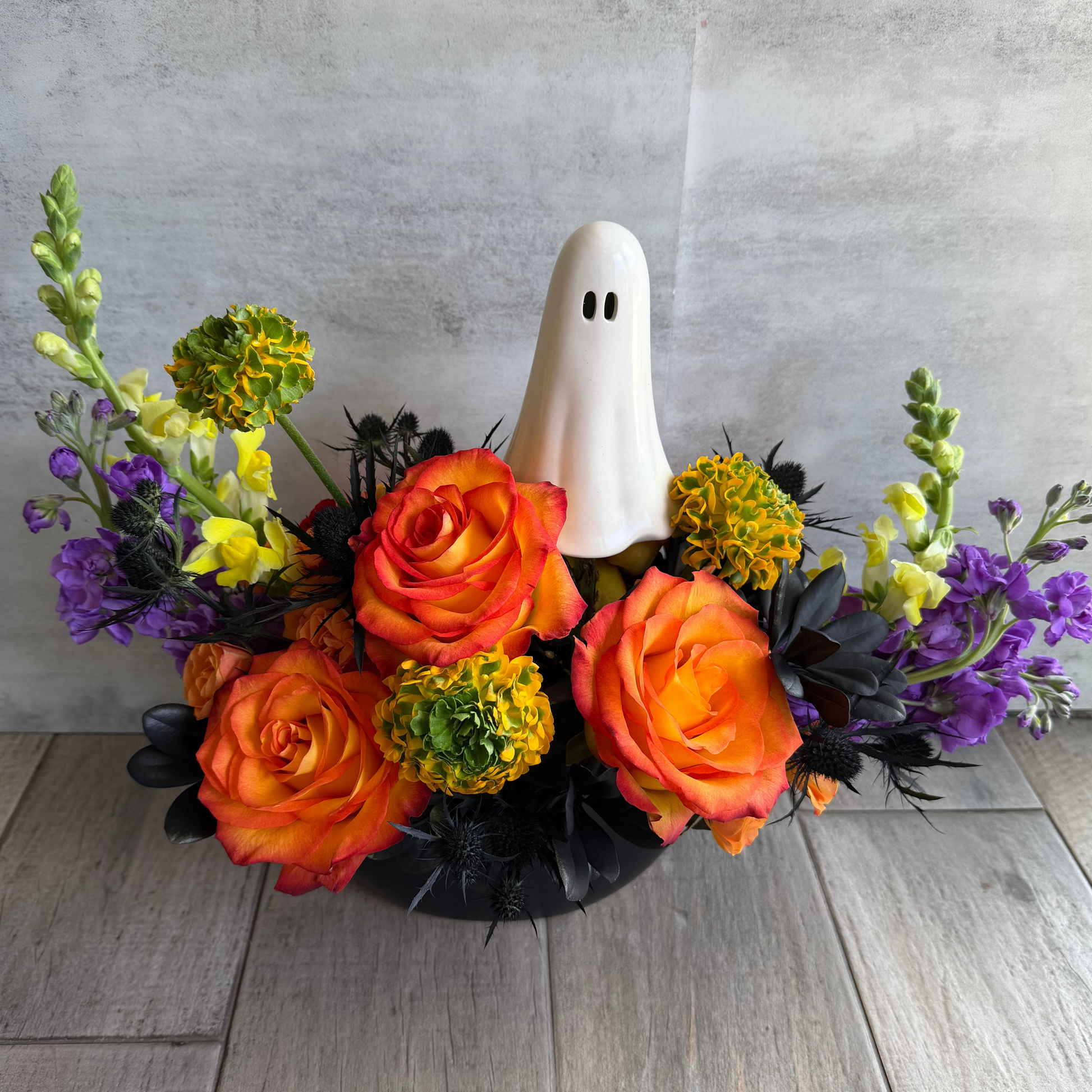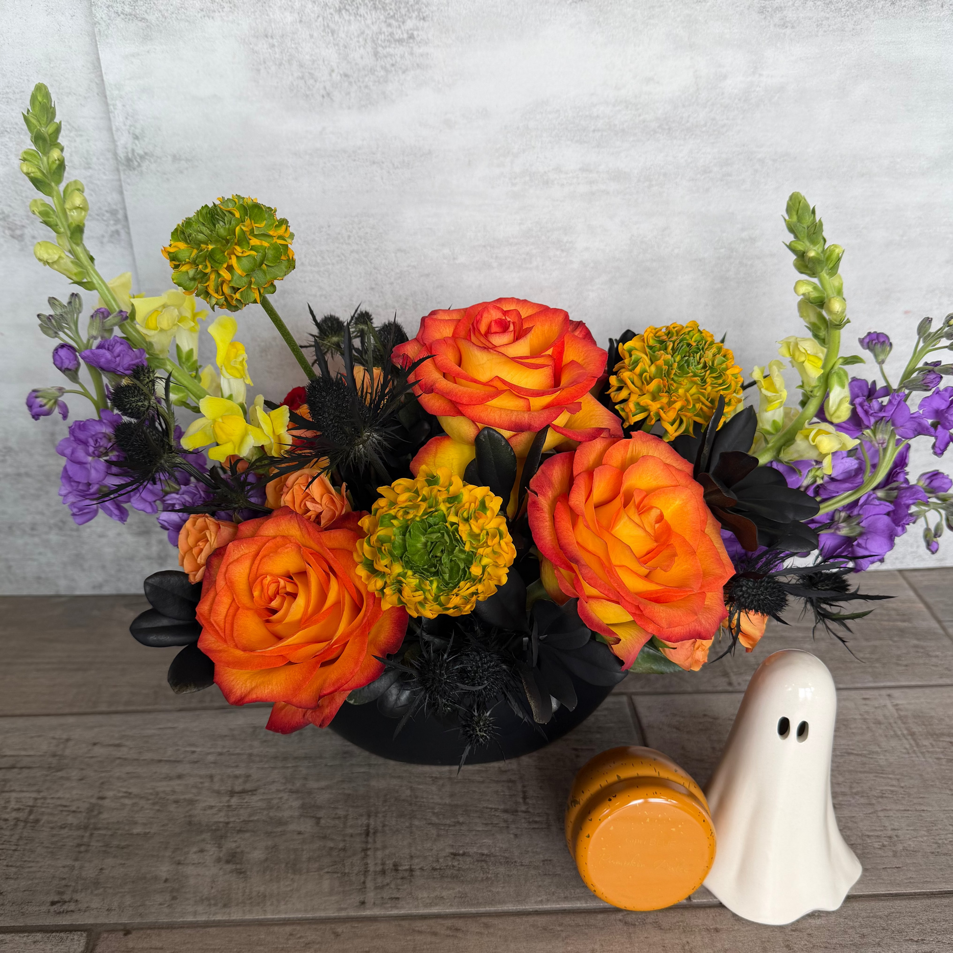 Introducing Boo Thang—a hauntingly beautiful Halloween floral arrangement that’s perfect for adding a touch of spooky elegance to your space. This enchanting bouquet blends rich, deep hues of green spider mums, fiery orange roses, and eerie purple stock, accented with wisps of ethereal snapdragons and thistle with dark foliage. Set in a sleek, gothic-inspired vase, the Boo Thang arrangement casts a spell of mystery and charm, making it a stunning centerpiece for your Halloween decor or a unique gift for your favorite ghoul