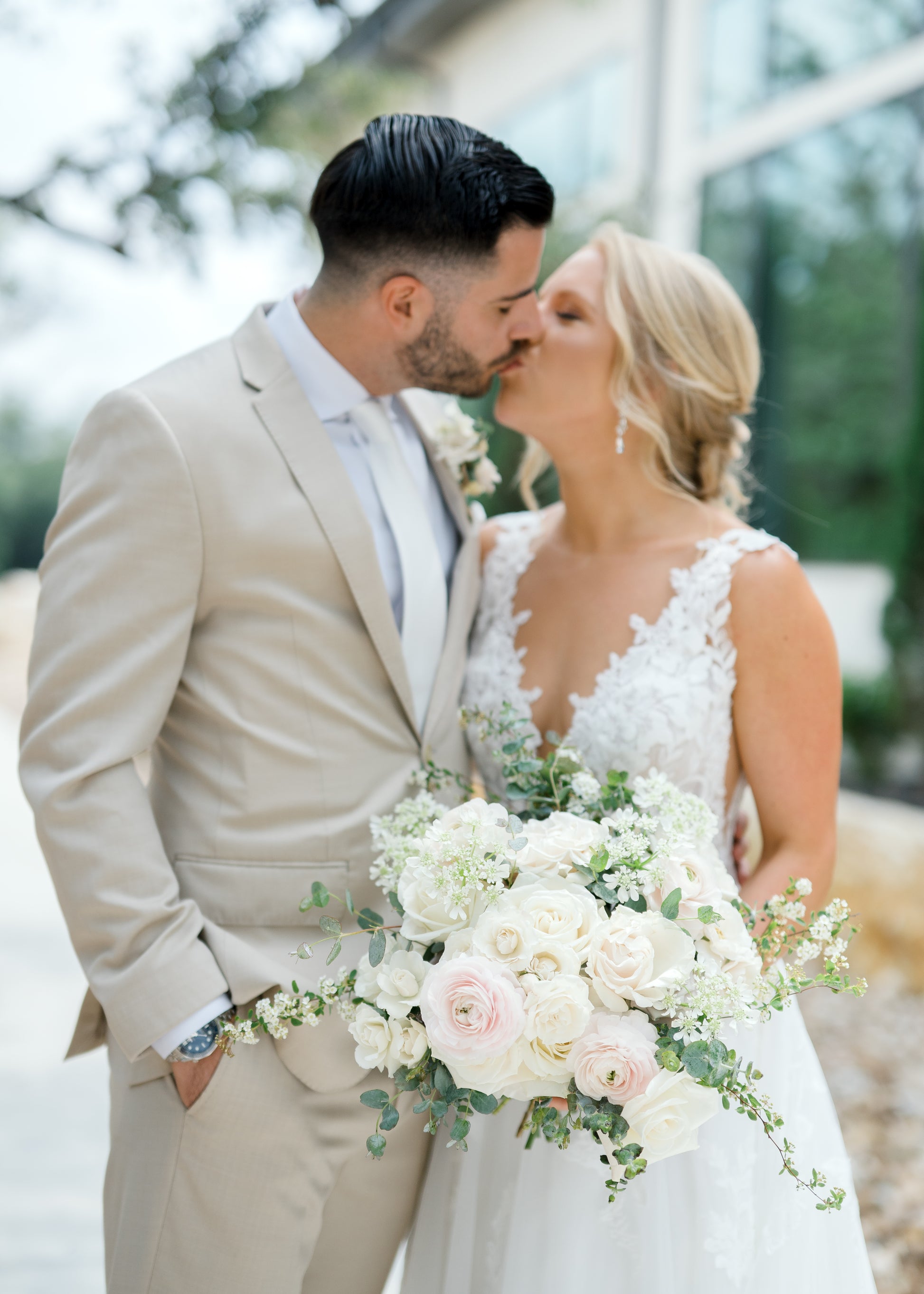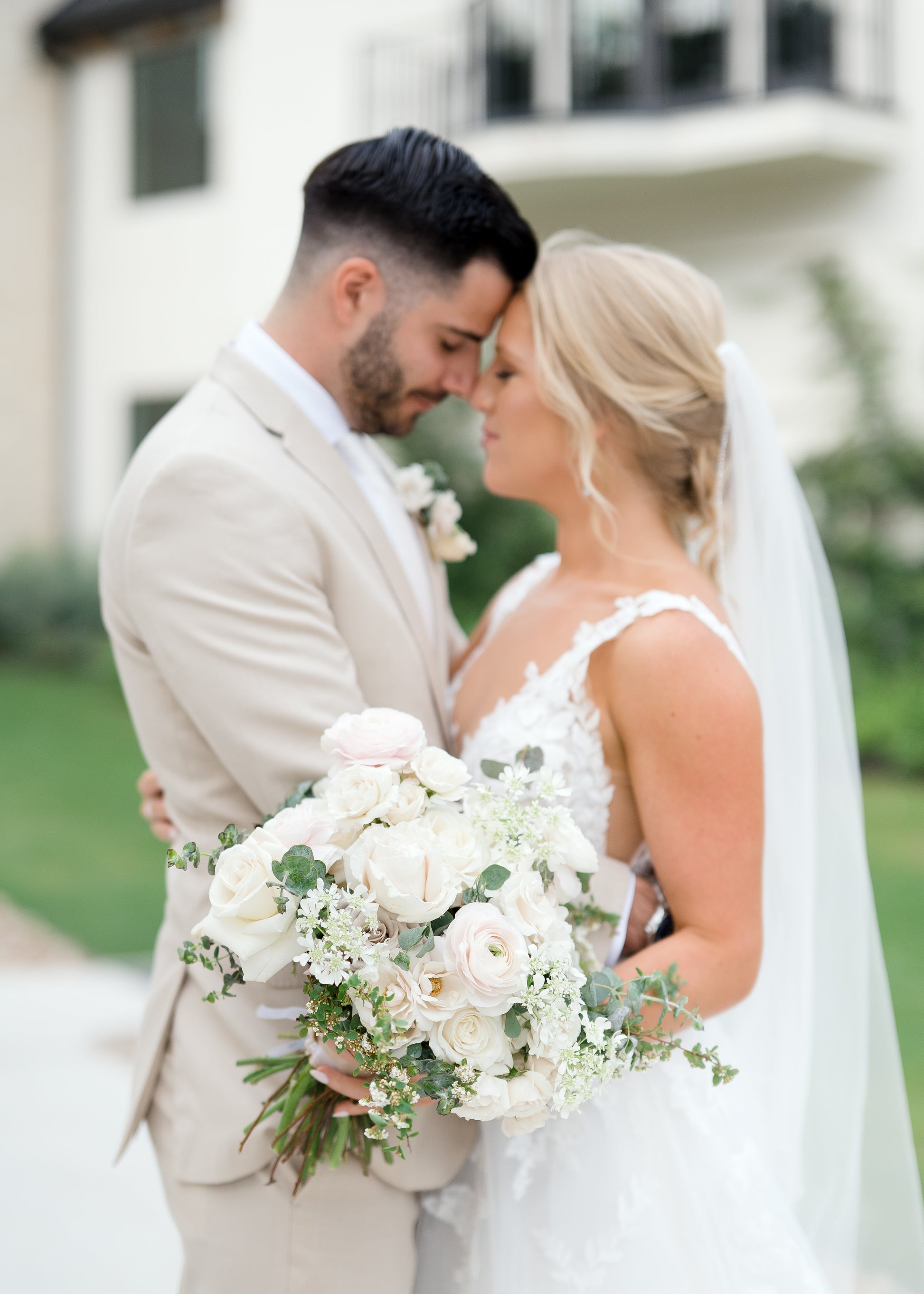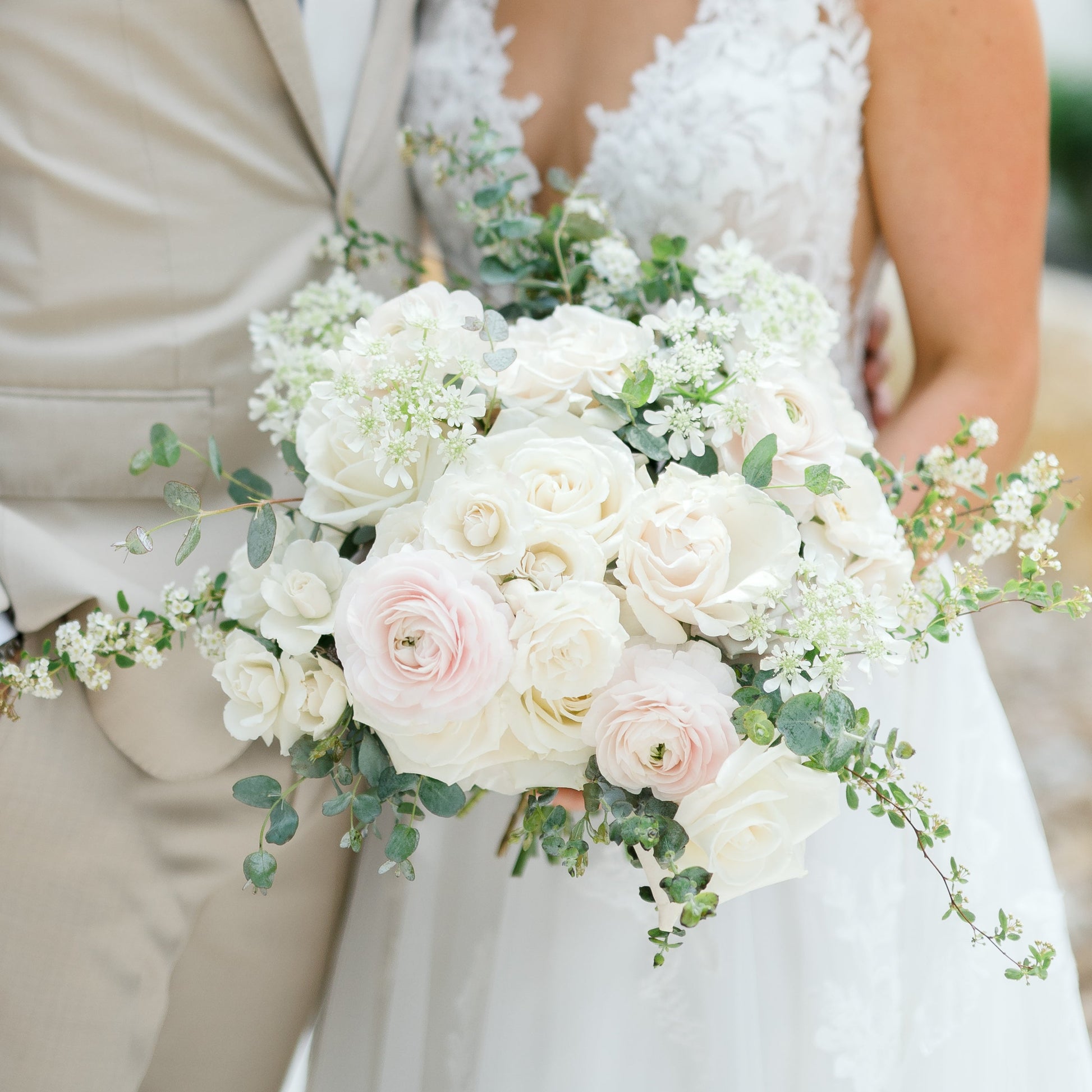 A gorgeous garden styled bouquet featuring a blend of blush and white roses, blush ranunculus, blush spray roses, vibrant greenery, and other textures, hand-tied with a ribbon wrapped stem. (No Vase Included)