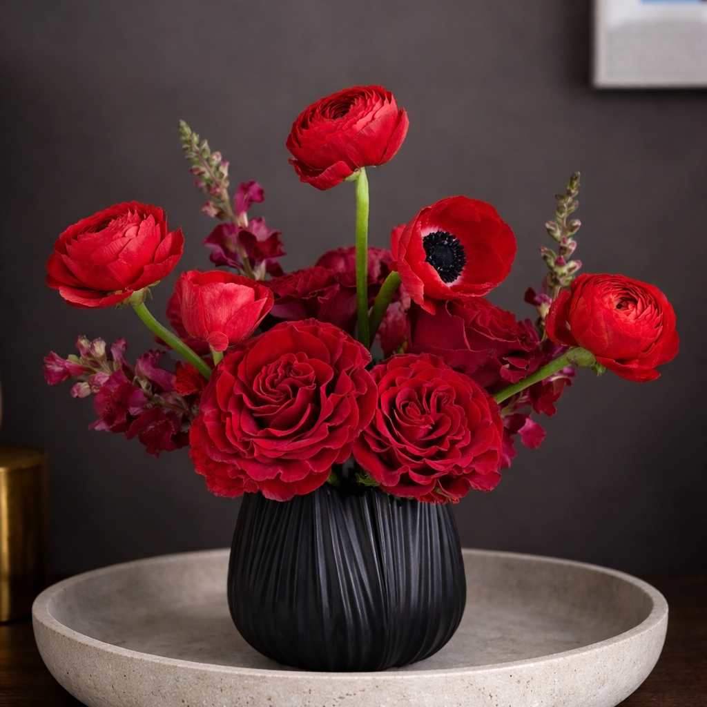 Enduring Desire features lush, velvety red blooms arranged with intention and balance—romantic, sculptural, and timeless. This arrangement is an ode to passion that deepens over time, created for those who believe true desire never fades.