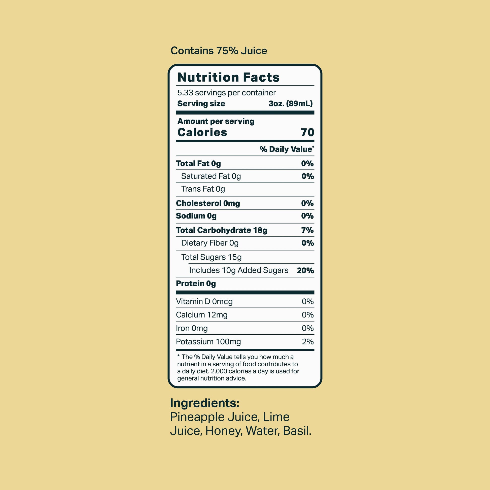 Our Pineapple Basil Lime premium cocktail mixer is made simply with pineapple, lime, honey, water and basil.