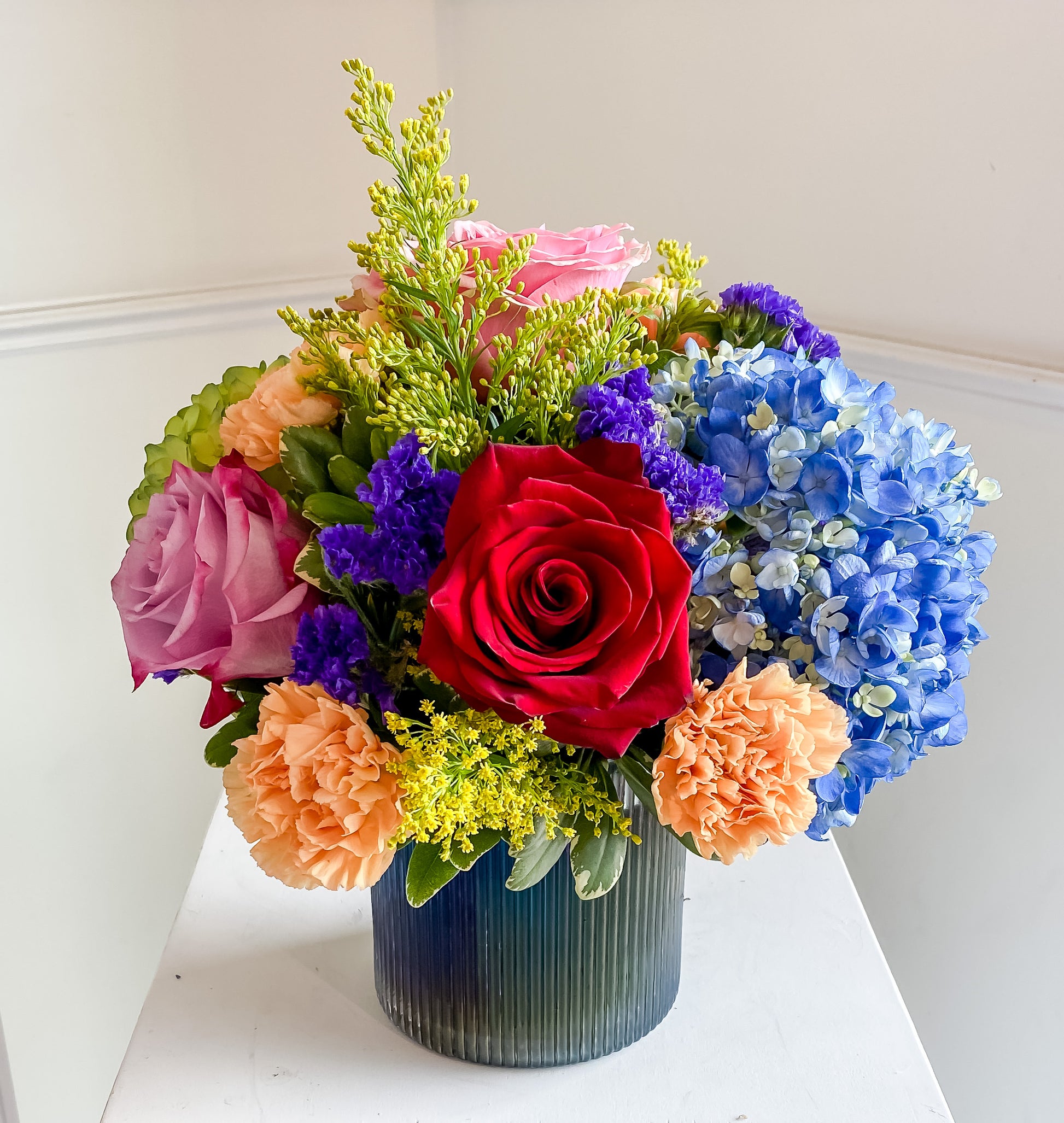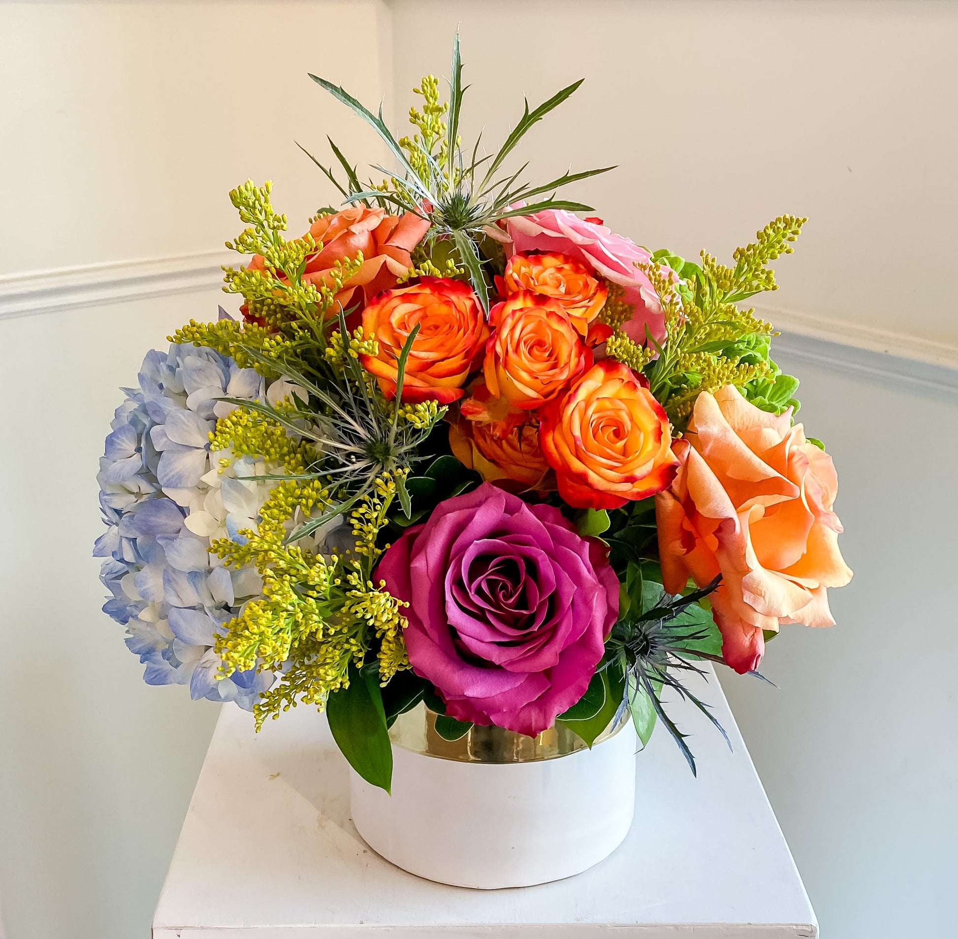 Ceramic Vase - low, lush, compact, flower-focused arrangement. Our Signature Style