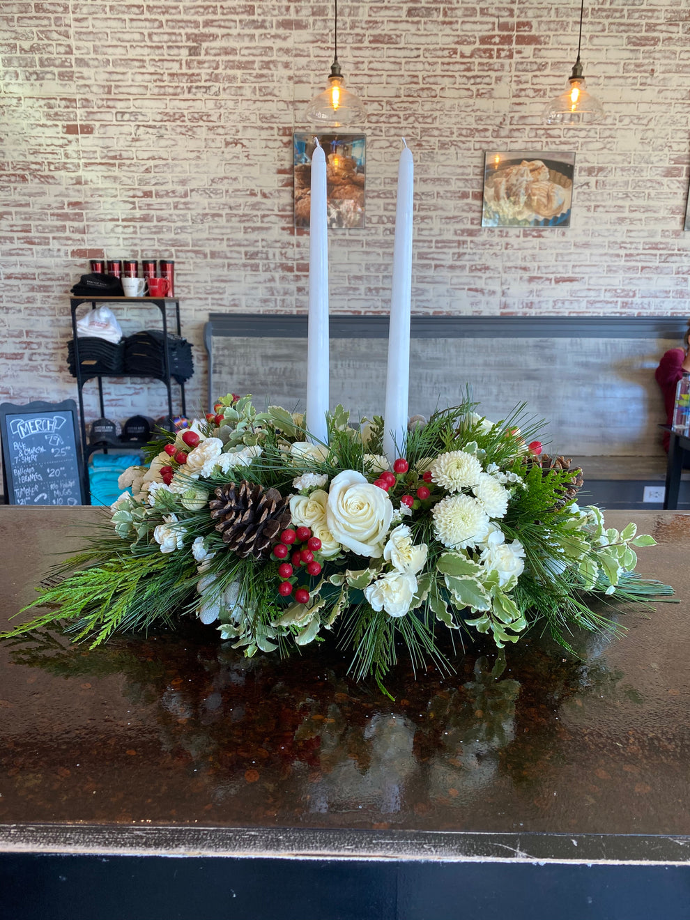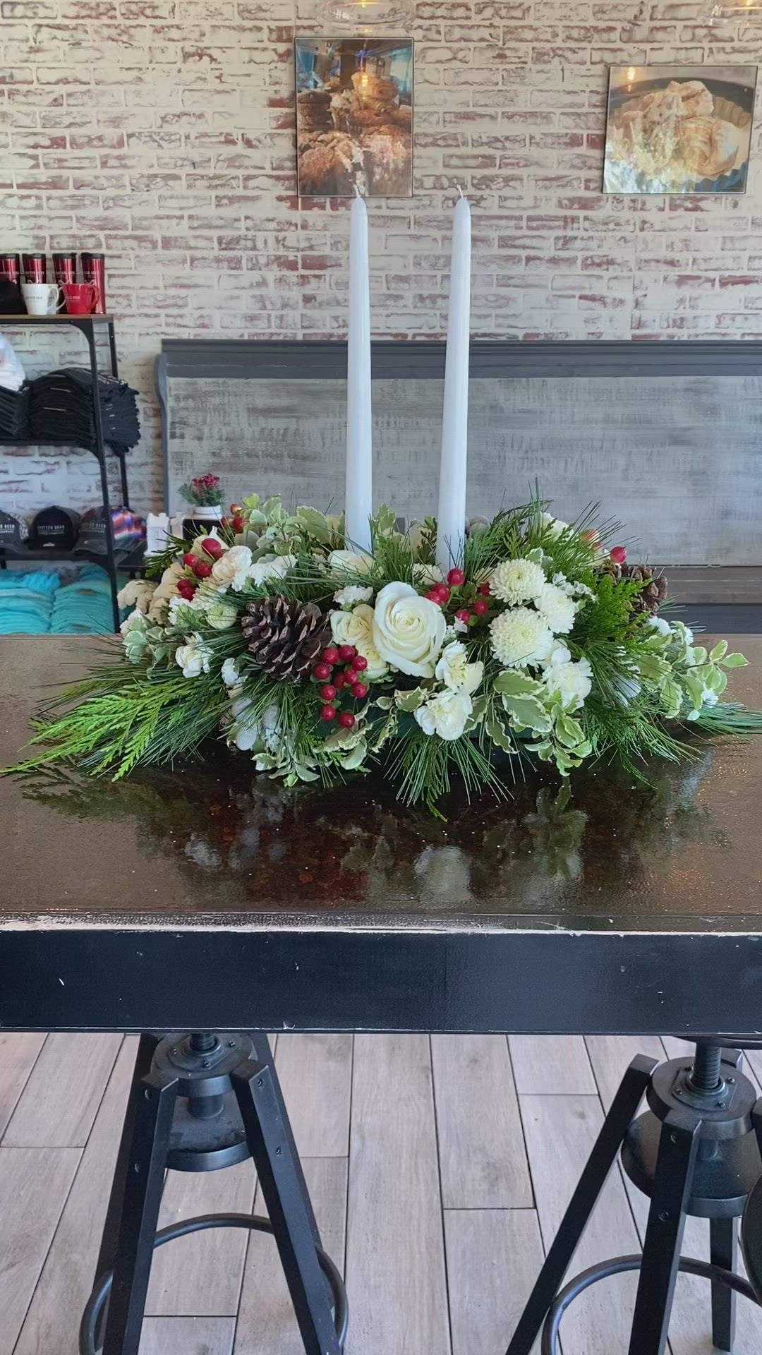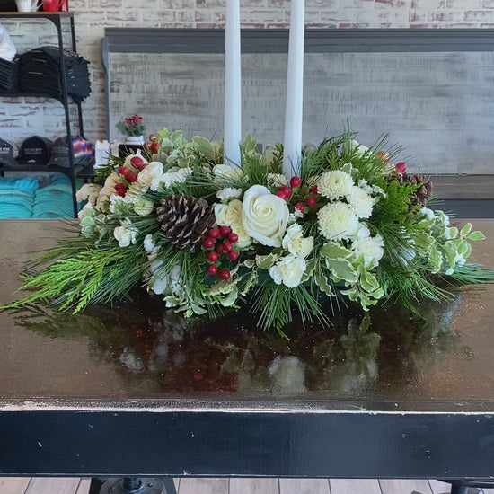 Splendid holiday centerpiece with warm candle light from two taper candles. Choose reds with white accents or whites with red accents.
