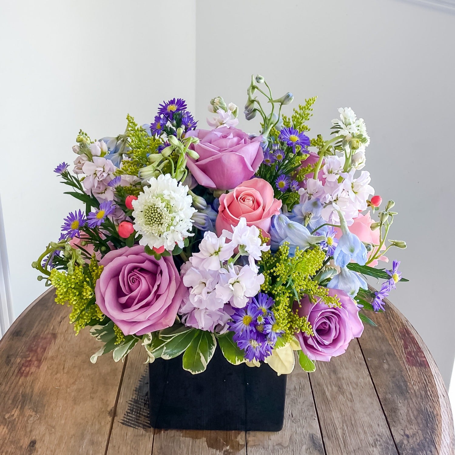 This Spring Mix arrangement is filled with flowers that create a garden-like feel. Pastel-colored roses, stock, hypericum berries, blue delphinium, aster, and solidago.